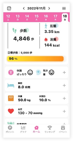 記録された歩数・歩行距離・消費カロリー・体重・血圧の推移はアプリ内からグラフで確認することができ、健康習慣の形成をサポートします。