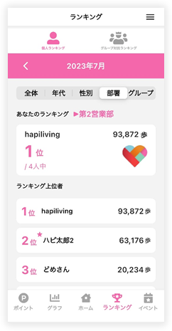 健康推進イベントの参加者や、毎日のウォーキング・健康記 録を頑張った人にポイント付与が行えるため、これまで健康 に無関心だった社員のモチベーション創出ができます。